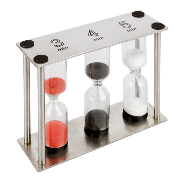 Trzy niewielkie szklane klepsydry wypełnione kolorowym piaskiem to estetyczny, a przede wszystkim praktyczny gadżet kuchenny, niezbędny w domu każdego amatora dobrze zaparzonej herbaty. Przesypujące się łagodnie drobne ziarenka piasku, wskazują kolejno 3, 4 i 5 minutowy czas zaparzania herbaty, w zależności od jej rodzaju i własnych upodobań. Ten ciekawy w formie przedmiot może stać się doskonałym prezentem samodzielnym, bądź też jako elegancki dodatek do zestawu wybranych rodzajów herbat. Ucieszą się z niego nie tylko doświadczeni miłośnicy dobrej herbaty, ale i osoby, które dopiero zaczynają swoją przygodę w odkrywaniu herbacianych smaków i aromatów.Czasomierz jest wysoki na 8 cm i szeroki na 8,5 cm.