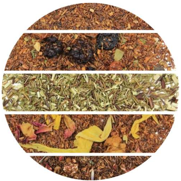 Wychodząc na przeciw oczekiwaniom naszych klientów stworzyliśmy zestawy próbek - idealne rozwiązanie dla osób, które poszukują nowych smaków i aromatów. W zestawie znajduje się pięć aromatycznych, bezteinowych herbat rooibos pakownych po 15 gram:- Greenbosh - zielony rooibos z niefermentowanych listków czerwonokrzewu afrykańskiego,- Rooibos - klasyczny, bez dodatków,- Rooibos chillout z orzeźwiającą nutą truskawki i mięty,- Rooibos Cuba Libre ze skórką pomarańczową, liśćmi limonki i eukaliptusa- Sen nocy letniej z aromatycznymi porzeczkami i jeżyną **w przypadku braku któregokolwiek z produktów zastrzegamy sobie prawo do wymiany na inny