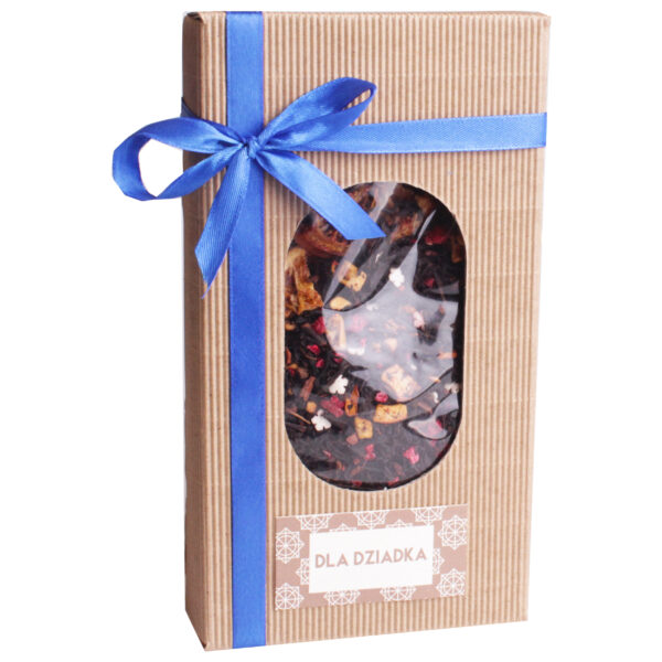 Podarunek stworzony na wzór tradycyjnych czekoladek z okienkiem. Stworzyny został dla naszych kochanych Dziadków, nie tylko z okazji ich święta.W specjalnie zaprojektowanym pudełku znajduje się 50 gramów herbaty czarnej z dodatkiem jabłka, pomarańczy, cynamonu, malin i cukrowych gwiazdek. Na opakowaniu, które wykonane jest z eleganckiej tektury falistej dołączony został bilecik "dla Dziadka".Prostota i elegancja połączona z pyszną herbatą napewno ucieszy obdarowanego.