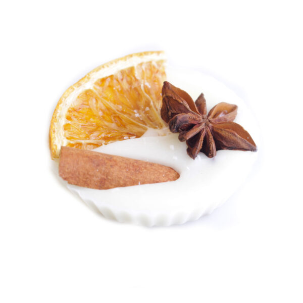 Ręcznie robiony, okrągły wosk sojowy. Jego zapach oraz wygląd już od pierwszej chwili wprawiają w świąteczny nastrój. Urocze plasterki egzotycznej pomarańczy idealnie komponują się z aromatycznym dodatkiem lasek cynamonu oraz gwiazdkami anyżu. Rozpalony wosk otuli nas swoim zapachem relaksując i odprężając.Jest to również idealna propozycja prezentu pod choinkę.Waga wosku: około 30g