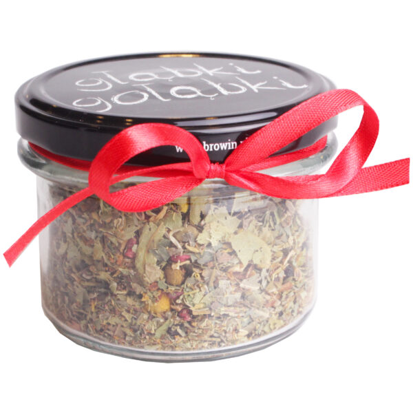 Pyszna, rozgrzewająca mieszanka ziołowa zamknięta w słoiczku. Mieszanka składa się z kwiatu lipy, liofilizowanej maliny, aromatycznego cynamon czy imbiru, które idealnie współgrają z liśćmi czarnej porzeczki, rumiankiem oraz aromatycznym anyżem. Całość dopełniona jest koprem, tymiankiem oraz owocami czarnego bzu. W smaku oraz zapachu gotowego naparu wyczujemy głównie ziołowe nuty przeplatane aromatem cynamonu, imbiru czy anyżu.Dzięki właściwościom pozytywnie wpływającym na nasz organizm, mieszanka idealnie sprawdzi się jako codzienne wsparcie odporności.Doskonały pomysł na drobny upominek dla bliskiej nam osoby.