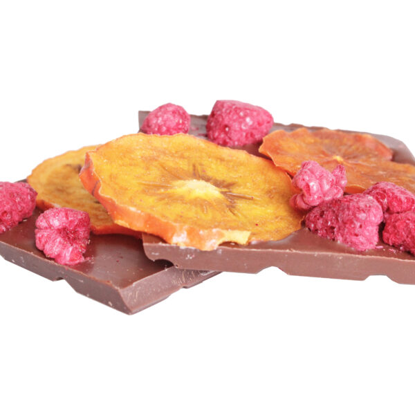 Bardzo ciekawa mleczna propozycja z dodatkiem malin i plasterków owocu kaki.Czekolada została wykonana, oraz ozdobiona ręcznie. Gęsta i kremowa konsystencja świetnie komponuje się z różnymi dodatkami.Zawartość malin oraz owocu kaki zapewni nam mleczny smak przeplatany intrygującą i mocno owocową nutą.Świetnie nadaje się jako samodzielny deser lub dodatek do innych słodkości. Dzięki pięknemu zdobieniu czekolada będzie doskonałym pomysłem na prezent.W zakładzie używane są: orzechy, migdały oraz mleko