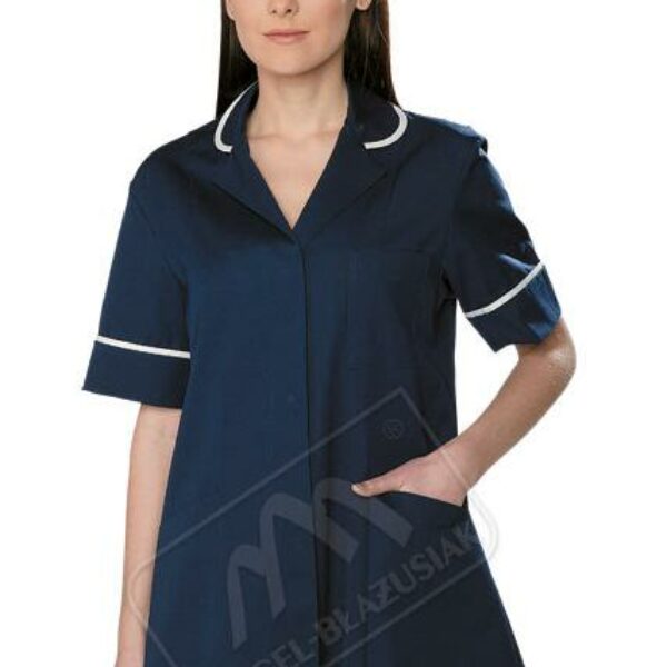 Bluza medyczna Eris z krótkim rękawem 3346-062 Ciemny granat zapinana na napy kryte w plisie podkrój szyi wykończony zaokrąglonym kołnierzem z kontrastową lamówką pionowe cięcia modelujące z przodu i z tyłu jedna kieszeń piersiowa naszywana dwie kieszenie dolne skośne rękawy krótkie wykończone mankietem, w szwie kontrastowa wypustka dół wykończony podwinięciem tkanina: 40%PES / 60%BW+ stretch; 210g/m2 dostępne rozmiary: 34-52 Tabela rozmiarów Dosętpne kolory: