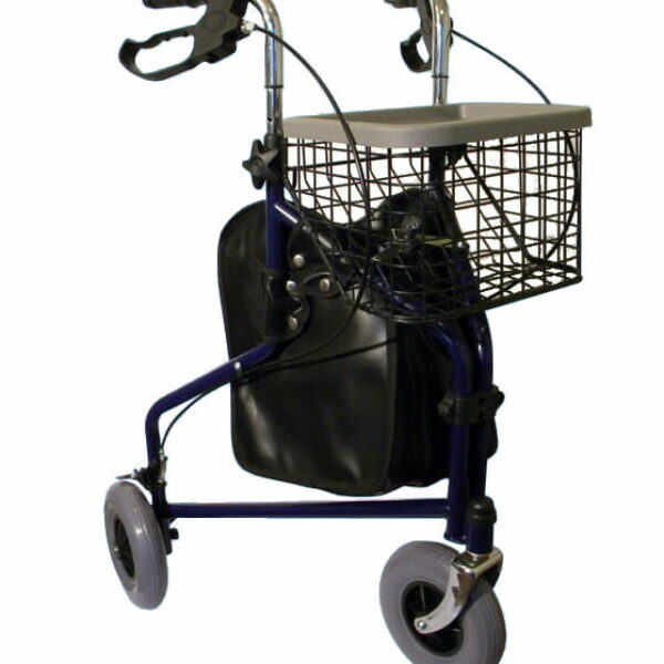 Balkonik trójkołowy z torbą i koszykiem Model AR-004 Balkonik jest sprzętem pomocniczo-rehabilitacyjnym przeznaczonym dla osób niepełnosprawnych ze schorzeniem narządu ruchu, z problemami pionizacji lub mających problem z utrzymaniem równowagi w czasie chodzenia. Wykorzystywany jest również dla utrzymania równowagi w czasie nauki chodzenia po przebytej chorobie lub urazie. Informacje o produkcie: rama stalowa, składana, lakierowana metodą proszkową stabilna i wytrzymała konstrukcja z regulacją wysokości rączek ergonomiczne, wyprofilowane uchwyty koła przednie bezobsługowe - 8” (20 cm) standardowe wyposażenie: hamulec z systemem postojowego blokowania torba na zakupy zamykana na suwak zdejmowany koszyk z pokrywką Parametry techniczne: Wysokość min.: 82 cm Wysokość max.: 98 cm Waga: 8,3 kg Maksymalne obciążenie: 110 kg Dostępny kolor: Granatowy