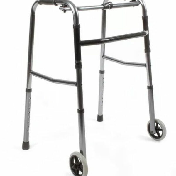 Balkonik aluminiowy składany, dwukołowy Model AR-003 Balkonik jest sprzętem pomocniczo-rehabilitacyjnym przeznaczonym dla osób niepełnosprawnych ze schorzeniem narządu ruchu, z problemami pionizacji lub mających problem z utrzymaniem równowagi w czasie chodzenia. Wykorzystywany jest również dla utrzymania równowagi w czasie nauki chodzenia po przebytej chorobie lub urazie. Informacje o produkcie: rama aluminiowa, wzmocniona składany za pomocą jednego przycisku stabilna i wytrzymała konstrukcja z regulacją wysokości ergonomiczne uchwyty koła przednie 5” (12 cm) Parametry techniczne: Szerokość: 50 cm Wysokość min.: 70 cm Wysokość max.: 83 cm Waga: 2,3 kg Maksymalne obciążenie: 136 kg Dostępne kolory: Srebrny, Miedziany