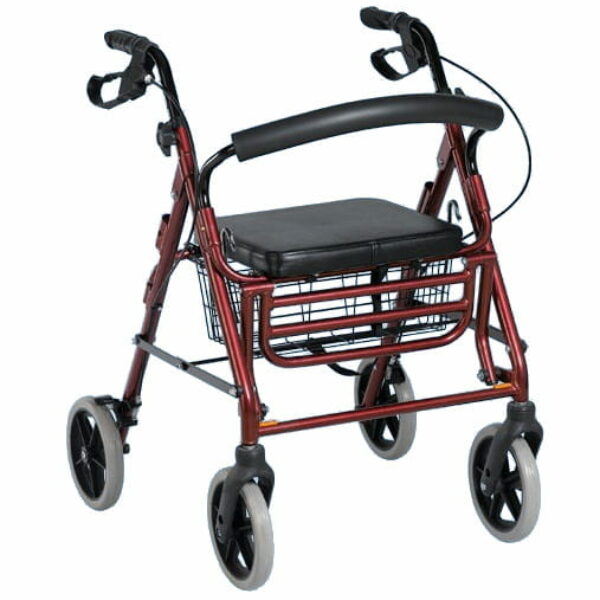 Podpórka rehabilitacyjna 4-kołowa - aluminiowa. COMFORT Model AR-022 Podpórka jest sprzętem pomocniczo-rehabilitacyjnym przeznaczonym dla osób niepełnosprawnych ze schorzeniem narządu ruchu, z problemami pionizacji lub mających problem z utrzymaniem równowagi w czasie chodzenia. Wykorzystywana jest również dla utrzymania równowagi w czasie nauki chodzenia po przebytej chorobie lub urazie. Używana często przez osoby starsze, niepełnosprawne oraz osoby z problemami narządu ruchu. Ogromną zaletą tej podpórki jest funkcja transportowa. Dzięki możliwości przepinania oparcia, siedzisku oraz rozkładanemu podnóżkowi, podpierającemu nogi istnieje możliwość przewożenia pacjenta. Ponadto wyposażenie w siedzisko z oparciem zdecydowanie zwiększa komfort użytkownika – możliwość odpoczynku podczas długich spacerów. Dodatkowo funkcja składania znacznie ułatwia przechowywanie. Informacje o produkcie: rama aluminiowa, składana - lakierowana stabilna i wytrzymała konstrukcja z regulacją wysokości rączek (co 2,5cm) wyprofilowane uchwyty 4 koła, bezobsługowe, pełne – 20 cm koła przednie skrętne wyposażenie standardowe: hamulce z funkcją postojową koszyk na zakupy siedzisko wykonane z tworzywa, uchylne oparcie, miękkie, odpinane rozkładany podnóżek Parametry techniczne: Wymiary siedziska: 35,5 x 33cm Wysokość do siedziska: 54cm Szerokość wewnętrzna pomiędzy rurkami: 46cm Wysokość rączek: 79-91cm Szerokość całkowita: 60cm Długość całkowita (złożony podnóżek): 67,5cm Długość całkowita (rozłożony podnóżek): 92cm Szerokość (grubość po złożeniu): 33cm Waga: 8,2 kg Maksymalne obciążenie: 136kg Dostępny kolor: Bordowy