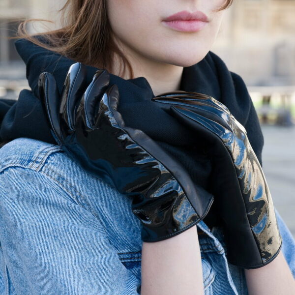 Damskie, ocieplane rękawiczki wykonane z błyszczącego materiału i naturalnej skóry z nową, niewidoczną i nieścieralną technologią touchscreen NAPOTOUCH.