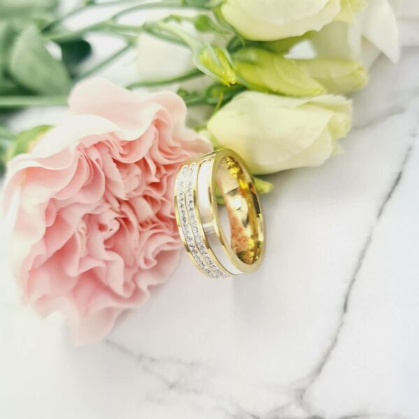 Pierścionek STAL CHIRURGICZNA obrączka linie cyrkonii Bardzo modna złota obrączka - dwie linie jasnymi cyrkonii i masa perłowa. Obrączka w całości wykonana ze stali chirurgicznej. Super jakość, cudownie błyszczą jasne cyrkonie w słońcu. Ekstra jakość PREMIUM. Szerokość obrączki 0,7 cm. Wybierz odpowiedni rozmiar. rozmiary (mierzone po wewnętrznej krawędzi): 7 - 1,8 cm, 8 - 1,9 cm, 9 - 2 cm, co to jest Stal chirurgiczna? Pierścionek wykonany z wysokiej jakości stali chirurgicznej 316L zwanej także nierdzewną lub szlachetną. Stal chirurgiczna 316L: ❤ nie zmienia koloru ❤ nie uczula ❤ nie reaguje z wodą!! Można jej praktycznie nie zdejmować. Biżuteria pozłacana (platerowana) 18k złotem oraz zabezpieczona lakierem jubilerskim który nadaje piękny połysk i zabezpiecza złocenie. Biżuteria jest antyalergiczna. Swój blask i kolor zachowa przez długi czas!! Świetna jakość wykonania. Stal chirurgiczna to wspaniała alternatywa dla często 10-krotnie droższej biżuterii wykonanej z metali szlachetnych takich jak złoto. Dzięki tak atrakcyjnej cenie możesz powiększać swoją kolekcję pięknej biżuterii na każdą okazję bez uszczerbku na domowym budżecie :)