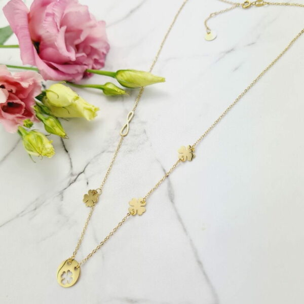 Naszyjnik Celebrytka nieskończoność koniczyny Naszyjnik klasyczna "Celebrytka" z przywieszkami: nieskończoność, małe koniczynki i medalion okrągły z wyciętą koniczyną. Przywieszki przedzielone na łańcuszku większymi oczkami - dzięki temu mogą być równomiernie rozmieszczone i nie przesuwają się. Łańcuszek zwany "celebrytką" to bardzo modny dodatek który szczególnie przypadł do gustu wielu kobietom. Delikatny łańcuszek w połączeniu z subtelnymi zawieszkami stał się bardzo popularny wśród gwiazd ekranu, wybiegów mody czy mediów społecznościowych. Wykonany z wysokiej jakości stali chirurgicznej 316L zwanej także nierdzewną lub szlachetną. Stal chirurgiczna 316L: ❤ nie zmienia koloru ❤ nie uczula ❤ nie reaguje z wodą!! Można jej praktycznie nie zdejmować. Biżuteria pozłacana (platerowana) 18k złotem oraz zabezpieczona lakierem jubilerskim który nadaje piękny połysk i zabezpiecza złocenie. Wymiary: długość całkowita łańcuszka 46 cm. Możliwość zapięcia także na 44 i 42 cm. Przywieszki wielkości ok. 0,8 cm, kółko 1 cm a nieskończoność 1,5/0,5 cm. Biżuteria jest antyalergiczna. Swój blask i kolor zachowa przez długi czas!! Świetna jakość wykonania.