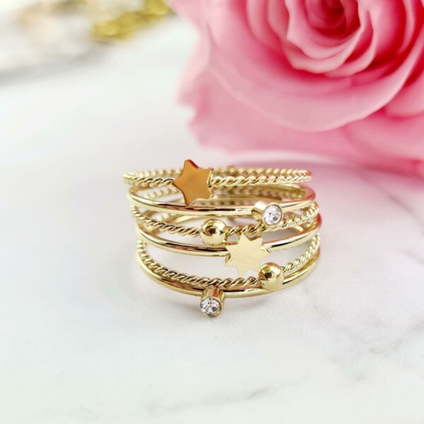 Pierścionek STAL CHIRURGICZNA obrączka ażurowa Bardzo modna złota szeroka obrączka ażurowa w całości wykonana ze stali chirurgicznej. Z przodu delikatne ozdoby gwiazdki, złote kulki i kryształki. Ekstra jakość PREMIUM. Wybierz odpowiedni rozmiar. rozmiary (liczone po wewnętrznych krawędziach): 6 - 1,7 cm. 7 - 1,8 cm, 8 - 1,9 cm, 9 - 2 cm. co to jest Stal chirurgiczna? Pierścionek wykonany z wysokiej jakości stali chirurgicznej 316L zwanej także nierdzewną lub szlachetną. Stal chirurgiczna 316L: ❤ nie zmienia koloru ❤ nie uczula ❤ nie reaguje z wodą!! Można jej praktycznie nie zdejmować. Biżuteria pozłacana (platerowana) 18k złotem oraz zabezpieczona lakierem jubilerskim który nadaje piękny połysk i zabezpiecza złocenie. Biżuteria jest antyalergiczna. Swój blask i kolor zachowa przez długi czas!! Świetna jakość wykonania. Stal chirurgiczna to wspaniała alternatywa dla często 10-krotnie droższej biżuterii wykonanej z metali szlachetnych takich jak złoto. Dzięki tak atrakcyjnej cenie możesz powiększać swoją kolekcję pięknej biżuterii na każdą okazję bez uszczerbku na domowym budżecie :)