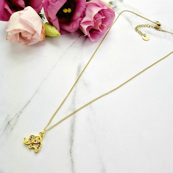 Naszyjnik Celebrytka słonik cyrkonie Naszyjnik delikatny z małą przywieszką w kształcie słonika z kolorowymi cyrkoniami. Słoń przynosi siłę, kiedy czujemy się słabo i prowadzi przez równiny do rozwiązania problemów. Przywołuje dawno zapomniane piękne chwile, wspomnienia oraz powody dla, których żyjemy. Dzięki temu przypomina nam o najważniejszych celach i daje pożywienie dla umysłu, duszy i ciała. Delikatny łańcuszek w połączeniu z subtelnymi zawieszkami stał się bardzo popularny wśród gwiazd ekranu, wybiegów mody czy mediów społecznościowych. Wykonany z wysokiej jakości stali chirurgicznej 316L zwanej także nierdzewną lub szlachetną. Stal chirurgiczna 316L: ❤ nie zmienia koloru ❤ nie uczula ❤ nie reaguje z wodą!! Można jej praktycznie nie zdejmować. Biżuteria pozłacana (platerowana) 18k złotem oraz zabezpieczona lakierem jubilerskim który nadaje piękny połysk i zabezpiecza złocenie. Wymiary: długość całkowita łańcuszka 44 cm. Możliwość regulacji (skrócenia) na zapięciu do -5 cm. Przywieszka słonik wielkości ok. 1,2 cm. Biżuteria jest antyalergiczna. Swój blask i kolor zachowa przez długi czas!! Świetna jakość wykonania.
