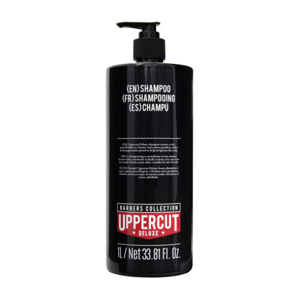 Uniwersalny kosmetyk marki Uppercut Deluxe. Dzięki zawartości licznych składników aktywnych szampon doskonale pielęgnuje skórę i włosy, minimalizując najpopularniejsze problemy męskiej skóry i włosów, takie jak: suchość, podrażnienia, wypadanie włosów, skłonność do przetłuszczania się i łupieżu, zniszczenia włosów wywołane stylizacją i farbowaniem. Dzięki zawartości ekstraktu z mięty pieprzowej szampon pozostawia subtelny, męski zapach i gwarantuje długotrwałe uczucie świeżości. Mocno się pieni, dzięki czemu doskonale oczyszcza skórę. Produkt przeznaczony do codziennego użytku.Składniki aktywne:hydrolizowane proteiny pszenicy – poprawiają strukturę skóry i włosów, nawilżają, ułatwiają rozczesywanie włosów,pantenol – nawilża, poprawia elastyczność oraz wytrzymałość skóry i włosów, odbudowuje uszkodzenia związane ze stylizacją i farbowaniem, ułatwia rozczesywanie, zapobiega rozdwajaniu końcówek,ekstrakt z chmielu – łagodzi, tonizuje i normalizuje skórę, ale także odmładza i regeneruje,ekstrakt z liści rozmarynu – silny przeciwutleniacz – chroni skórę przed szkodliwym działaniem czynników zewnętrznych, a także wspomaga regenerację skóry i przyspiesza wzrost włosów,ekstrakt z korzenia lukrecji – regeneruje zniszczone włosy, działa przeciwzapalnie i normalizująco na skórę – redukuje łupież oraz przetłuszczanie się skóry i włosów,ekstrakt z rumianku – łagodzi, koi, odświeża włosy i nadaje im zdrowego blasku, ogranicza skłonność do powstawania łupieżu i przetłuszczania się włosów, ułatwia układanie włosów i odżywia ich cebulki,olejek z mięty pieprzowej – nadaje przyjemny zapach i pozostawia uczucie świeżości, chroni przed powstawaniem łupieżu i stanów zapalnych.Polecany dla: wszystkich rodzajów męskiej skóry i włosów.Sposób użycia: niewielką ilość szamponu spienić w dłoniach, a następnie nałożyć na wilgotne włosy. Dokładnie wmasować i spłukać letnią wodą. Produkt przeznaczony do codziennego stosowania.Pojemność: 1000mlSkład: Aqua, Sodium Laureth Sulfate, Cocamide DEA, Cocobetaine, Salt, Sodium Lauryl Sarcosinate, PEG-7 Glyceryl, Cocoate, Polyquaternium-7, Panthenol, Cocodimonium Hydroxypropyl, Hydolyzed Wheat Protein, Glycyrrhiza Glabra (Licorice) Root Extract, Chamomilla Recutita (Matricaria) flower extract, Mentha Piperita (Peppermint) Oil, Humulus Lupulus (hops) Extract, Rosmarinus Officinalis (Rosemary) leaf extract, PEG-12 Dimethicone Guar Hydroxypropyltrimonicum Chloride, Sodium Edetate, Citric Acid, Methylchloroisothiazolinone, Parfum.