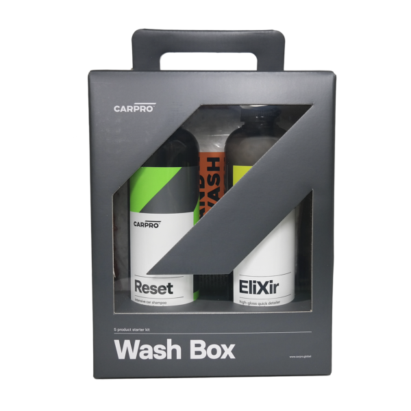 CarPro Wash Box – to doskonałe rozwiązanie dla entuzjastów pielęgnacji pojazdów zabezpieczonych powłoką CQuartz, a także tych, którzy dopiero rozpoczynają swoją przygodę z detailingiem.Zestaw zawiera:CarPro Reset 500ml – szampon do mycia karoserii,CarPro Elixir 500ml – quick detailer do nabłyszczenia i zabezpieczenia lakieru do następnego mycia,CarPro Hand Wash MF – delikatna rękawica z mikrofibry do mycia samochodu,CarPro 2 Face 40x40cm – mikrofibra do dotarcia quick detailera,CarPro DHydrate 50x55cm – ręcznik do osuszenia lakieru po myciu.