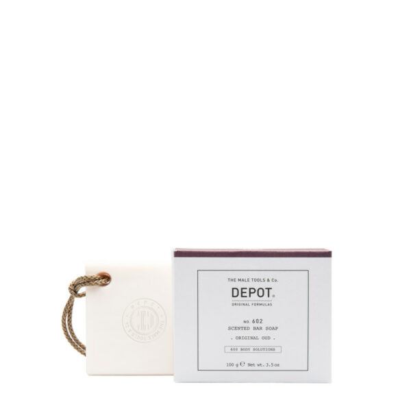 Depot 602 Scented bar soap - original OUD czyli mydło w kostce do mycia ciała o zapachu OUD.Urzekające zapachem OUD mydło jest bogate w składniki pielęgnujące i odżywiające męską skórę. W przeciwieństwie do wielu mydeł do ciała przyjemnie się pieni - wtedy też pachnie najmocniej. Aby ułatwić korzystanie z mydła producent dodał do niego funkcjonalny sznurek.Cechy charakterystyczne:Kompleks botaniczny, mieszanka 10 ekstraktów roślinnych o niezwykle korzystnym wpływie na skóręErytrytol, środek utrzymujący wilgoć, pomaga zachować miękkość i elastyczność skóryGliceryna, środek utrzymujący wilgoć, utrzymuje prawidłowy poziom nawilżeniaWaga: 100gZapach: Original OUD with spicy and slightly floral fragrance. Zapach OUD wzbogacony o nuty kwiatowe.Sposób użycia: Do mycia należy delikatnie zwilżyć mydło i spieniać je w rękach lub bezpośrednio na gąbce do mycia.