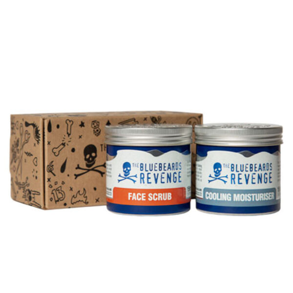 Zestaw do pielęgnacji twarzy marki Bluebeards Revenge.Idealny zestaw dla faceta lubiącego o siebie dbać! Dzięki zawartych w nim produktom Twoja skóra będzie odpowiednio odżywiona i bez podrażnień.W skład zestawu wchodzi:Face Scrub 150ml - Rewelacyjny złuszczający kosmetyk do twarzy brytyjskiej bestsellerowej marki! Face Scrub świetnie poradzi sobie z pozbyciem się martwego naskórka z twarzy, co poprawi kondycję skóry i zarostu. Dzięki zawartości zmielonych pestek oliwki i ekstraktowi z imbiru działa podwójnie intensywnie.Cooling Moisturiser 150ml - Krem po goleniu o właściwościach dezynfekujących, łagodzących i chłodzących. Lekka, ale jednocześnie bogata formuła produktu szybko się wchłania, pozostawiając skórę nawilżoną i odświeżoną. Łagodzi powstałe w trakcie golenia mikropodrażnienia. Dzięki zawartych w kremie ekstraktach roślinnych i olejkach, odżywia i przyśpiesza regenerację, a zawarty w nim mentol daje uczucie chłodzenia. Zapobiega powstawaniu stanów zapalnych wywołanych goleniem.