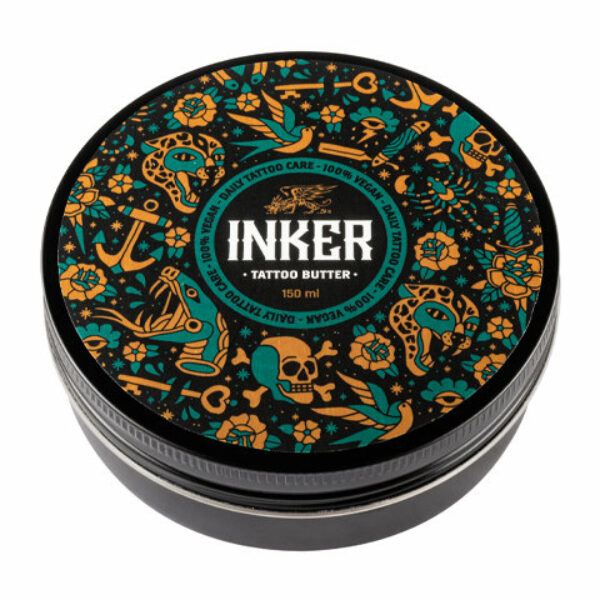Inker Tattoo Butter to nowy poziom pielęgnacji tatuażu!Wegańskie masło do tatuażu stworzone na bazie naturalnych składników. Zawarte w nim masło mango nawilża skórę oraz przyśpiesza jej regenerację. Masło Shea natłuszcza, działa antybakteryjnie i przeciwzapalnie. Mieszanka olejów z pestek winogron, orzechów makadamia nasion marchwi oraz brokułów poprawia kondycję skóry, wygładza i nadaje jej sprężystości. Dodatek witaminy E odżywia skórę i pomaga przywrócić jej właściwą kondycję. Całość dopełnia innowacyjny peptyd Palmitoyl Tetrapeptide-68 Amide, stworzony z myślą o pielęgnacji nawet najbardziej problematycznej skóry. Dzięki swojemu działaniu odbudowuje oraz wzmacnia barierę ochronną naskórka.Inker Tattoo Butter sprawdza się doskonale w codziwnnym użyciu jako alternatywa dla maści i kremów, a także jako zamiennik klasycznej wazeliny.Masło posiada przyjemny i świeży aromat brzoskwini i mango, będący połączeniem pozbawionych alergenów kompozycji zapachowych. Zamknięty został w wygodnej puszce, która pozwala w wygodny sposób dozować produkt.Zadbaj o swoją skórę, tak jak na to zasługuje i utrzymaj swoje tatuaże w doskonałej kondycji przez długie lata.KOMPOZYCJA ZAPACHOWA: Brzoskwinia i mango SKŁADNIKI: Butyrospermum Parkii Butter, Mangifera Indica Seed Butter, Hydrogenated Soybean Oil, Cocos Nucifera Oil, Vitis Vinifera Seed Oil, Macadamia Ternifolia Seed Oil, Daucus Carota Sativa Seed Oil, Brassica Oleracea Italica Seed Oil, Helianthus Annuus Seed Oil, Copernicia Cerifera Cera, Tocopheryl Acetate, Palmitoyl Tetrapeptide-68 Amide, Parfum.SPOSÓB UŻYCIA: Nałóż niewielką ilość masła na skórę i delikatnie rozprowadź po całym tatuażu.NIE ZAWIERA: olejów silikonowych, parafiny, sztucznych barwników, konserwantów.INFORMACJE O BEZPIECZEŃSTWIE KOSMETYKUprzebadany dermatologicznieprodukt nie testowany na zwierzętachprodukt nie zawiera składników pochodzenia zwierzęcego