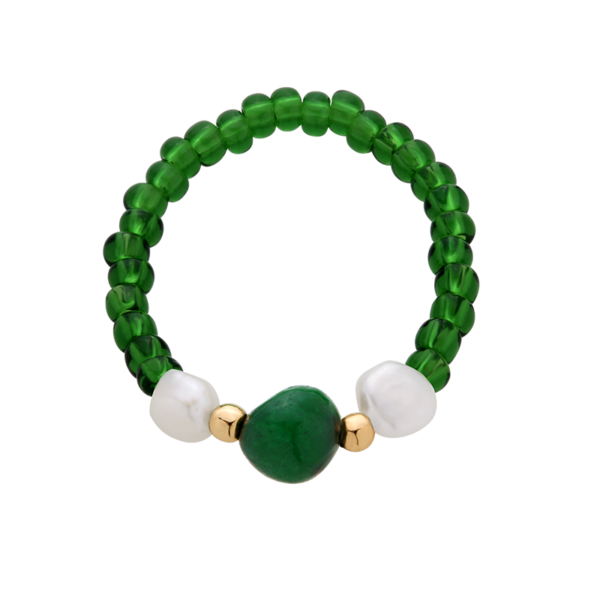 Pierścionek elastyczny z agatem, perłami i koralikami w najmodniejszym odcieniu zieleni.