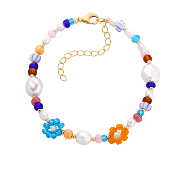 Bransoletka z koralikami szklanymi i nieregularnymi perłami, wykończony dwoma kwiatkami i kuleczkami GF.