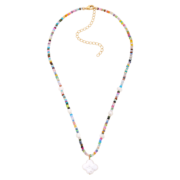 Naszyjnik ze szklanych koralików i kuleczek GF, wykończony piękną perłową zawieszką.