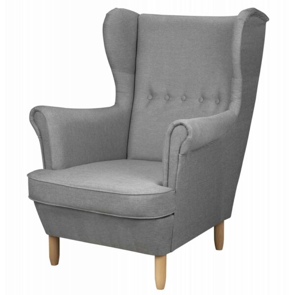 Fotel wykonany w skandynawskim stylu. Wysokie i komfortowe oparcie oraz duże, wyprofilowane podłokietniki zapewniają wyjątkowo wygodny wypoczynek. Fundament mebla stanowią cztery solidne, drewniane nóżki w naturalnym jasnym kolorze. Głębokie siedzisko i wygodne oparcie z charakterystycznymi "uszami" tzw. uszak to produkt cieszący się ostatnio bardzo dużą popularnością.