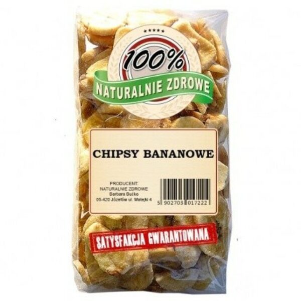 Mało osób wie, że suszone owoce zawierają tyle samo, a czasem nawet więcej witamin i składników odżywczych, niż świeże. Wszystko przez to, że w trakcie procesu suszenia z owoców odparowuje woda, w efekcie czego stają się praktycznie witaminowym koncentratem. Suszone plasterki bananów nie są wyjątkiem! To sprawia, że chipsy bananowe dostępne w naszej ofercie są nie tylko smaczną, ale także wyjątkowo zdrową przekąską oraz doskonałą alternatywą dla zwykłych słodyczy.Zdrowszy zamiennik słodyczyNa początku musimy jednak zaznaczyć, że chipsów bananowych nie należy jeść w dużych ilościach. Chipsy bananowe dostępne w naszej ofercie mają w składzie olej kokosowy, w związku z czym jest to przekąską wysokokaloryczna. Z tego względu i w uwagi na wysoki wskaźnik indeksu glikemicznego, nie powinny ich spożywać osoby na diecie oraz cierpiący na cukrzycę. Z drugiej jednak strony połączone właściwości banana i oleju kokosowego sprawiają, że nasze chipsy bananowe są również przekąską wyjątkowo zdrową!Banany zawierają w sobie duże ilości potasu i magnezu, a także fosforu i wapnia. Na uwagę zasługuje szczególnie ilość potasu, którego jest około 400mg w średniej wielkości bananie. Duża jest też zawartość witamin A, B, D i K, a olej kokosowy znany jest ze swoich prozdrowotnych właściwości, takich jak zwiększanie ilości dobrego cholesterolu i regulowanie poziomu glukozy we krwi. Dzięki temu wysokoenergetyczne banany i obniżający ich indeks glikemiczny olej kokosowy doskonale się uzupełniają!Banan jest również owocem szczególnie polecanym osobom starszym, które zmagają się z chorobami układu krwionośnego. Wspomniana już wcześniej duża zawartość potasu wpływa korzystnie na ciśnienie krwi dlatego osoby zmagające się z miażdżycą czy nadciśnieniem powinny zdecydowanie włączyć banany do swojej diety!Banan to także bogate źródło błonnika. Oznacza to, że jego spożywanie wspiera procesy trawienne, polepsza metabolizm i reguluje pracę jelit. Dodatkowo obniża poziom złego cholesterolu LDL w krwi.Jak jeść suszone banany? Możliwości jest wiele. Można je stosować jako zamiennik tradycyjnych chipsów, można również dodać je do owsianki lub ulubionych wypieków. Warto sięgać po nie szczególnie przed wzmożonym wysiłkiem fizycznym – w krótkim czasie dostarczą do organizmu niezbędnych podczas treningu łatwo przyswajalnych węglowodanów.Kupując chipsy bananowe, pamiętaj jednak, żeby zwracać uwagę na skład i wybierać produkty wysokiej jakości. Dokładnie takie, jak w chipsy bananowe w naszej ofercie. Krótki skład, brak zbędnych dodatków chemicznych – to gwarancja produktu wysokiej klasy. Tylko wtedy będziesz mógł w pełni cieszyć się nie tylko ich wybornym smakiem, lecz również właściwościami. Skład: chipsy bananowe plastry bez konserwantów, cukier, olej kokosowy, naturalny aromat bananowyKraj pochodzenia: FilipinyMasa netto: od 500 g W zakładzie wykorzystywane są surowce zawierające: gluten, sezam, różne orzechy.Data przydatności i numer partii towaru znajdują się na opakowaniu.Przechowywać szczelnie zamknięte w suchym i chłodnym miejscu.Opakowanie może różnić się wyglądem w zależności od partii towaru. Wartość odżywcza w 100 g produktuWartość energetyczna2225 kJ / 533 kcalTłuszcz31 gw tym kwasy tłuszczowe nasycone13 gWęglowodany60 gw tym cukry17 gBłonnik3,4Białko1,8 gSól0 g PRODUCENT: NATURALNIE ZDROWE Barbara Bućko 05-420 Józefów ul. Matejki 4