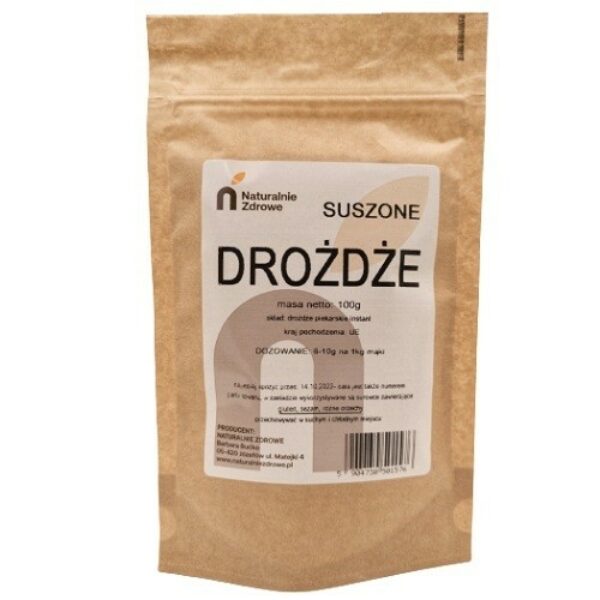 DROŻDŻE PIEKARSKIE SUCHE CHLEBY CIASTA PIZZEDrożdże instant w proszku to produkt, który umożliwia wyrastanie i spulchnianie wypieków, więc doskonale sprawdzi się w każdej kuchni. Dzięki różnorodnym możliwościom jego zastosowania ciasta drożdżowe, aromatyczne chleby i chlebki, bułki, ciasta ciężkie i wiele innych wypieków od wielu lat goszczą na naszych stołach. Historia stosowania produktu w celach spożywczych sięga starożytności, kiedy to efekt fermentacji uzyskiwano za pomocą drożdży zawartych w skórkach winogron. Stąd też początkowo ich głównym przeznaczeniem była produkcja alkoholi. Dopiero z czasem znalazły zastosowanie w piekarnictwie, gdzie produkt jest obecny do dnia dzisiejszego w zmienionej formie.Drożdże piekarskie suche – właściwościDrożdże instant są znacznie mocniejsze niż drożdże świeże, gdyż już niewielka ilość wystarczy, aby spulchnić ciasto. 7-9 g drożdży instant odpowiada 25 g świeżych, to porcja na 1 kg mąki) To oznacza, że nawet małe opakowanie 100 g drożdży wystarczy na wypiek około 25 bochenków z naszych mieszanek chlebowych. Dodatkowo stabilność i moc drożdży suszonych instant pozwala przyspieszyć proces fermentacji, dzięki czemu do momentu wyrośnięcia ciasta nie minie dużo czasu.Warto w szczególności podkreślić, że drożdże instant nie różnią się w działaniu od świeżych drożdży. Oba produkty dadzą finalnie podobny efekt, ale termin zdatności drożdży świeżych jest zdecydowanie krótszy niż suchych drożdży.Suszone drożdże piekarskie – zastosowanieSuszone drożdże piekarskie to produkt, który idealnie sprawdzi się do wypieku chleba, bułek, pizzy i wszystkich rodzajów ciast drożdżowych. W przeciwieństwie do świeżych drożdży tradycyjnych nie wymagaja sporządzenia rozczynu z dodatkiem ciepłej wody lub mleka. Są więc szczególnie polecane przy:wypieku domowego pieczywa (chleba, bułek, chałek)pieczenia ciastpieczenia pizzyDzięki zastosowaniu specjalnej technologii suszenia, drożdże zachowują pełne właściwości spulchniające nawet przy dłuższym przechowywaniu. Dzięki temu nie trzeba mieć zapasu drożdzy w lodówce. Należy jednak pamiętać, że po otwarciu drożdże suszone instant wymagają przechowywania w szczelnie zamkniętym opakowaniu, aby nie traciły swoich właściwości. Polecamy zapakowanie produktu w worek strunowy lub folię spożywczą, które ułatwią utrzymanie odpowiednich warunków jego przechowywania.Domowy chlebDrożdże suszone instant w naszym sklepie to produkt, który może stanowić składową wypieku domowego chleba, a w oferowanych wielkościach stanowią także ekonomiczne rozwiązanie dla branży spożywczej i wytwórców pieczywa.Skład:drożdże suche, E491Producent: Naturalnie Zdrowe Barbara Bućko