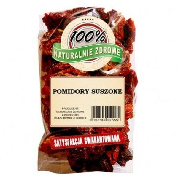 Czy da się zamknąć smak i zapach lata w przetworach? Oczywiście, a najlepszym dowodem na to są nasze suszone pomidory, których aromat przypomni Ci o ciepłych, pełnych słońca wakacjach. Nie można jednak zapominać, że wyjątkowe walory smakowe to nie wszystko, co suszone pomidory mają do zaoferowania. Te wyborne owoce są także pełne witamin i składników odżywczych, które sprawiają, że są one idealnym uzupełnieniem diety – nie tylko tej jesienno-zimowej!Pomidory suszone suche bez olejuSuszone pomidory są pełne witaminy C i K, a także cennego likopenu – czyli związku z grupy karotenów, którego spożywanie zapobiega rozwojowi wielu różnych nowotworów. Poza tym suszone pomidory to doskonały dodatek do sałatek czy tostów. Suszonymi pomidorami można udekorować pyszną sałatkę z mozzarellą, a także przyrządzić z nich wyśmienitą pastę, która będzie o wiele smaczniejszym, zdrowszym oraz bardziej dietetycznym zamiennikiem popularnego keczupu. Zwłaszcza jeśli zdecydujesz się wybrać nasze pomidory!Suszone pomidory, które znajdziesz w Naturalnie Zdrowe, to produkt najwyżej jakości. Nie tylko mają doskonały skład bez zbędnych dodatków i konserwantów, lecz również nie zawierają oleju. To sprawia, że mają o wiele mniej kalorii, niż suszone pomidory, które w sklepach przeważnie można znaleźć w słoikach z zalewą. Dzięki temu nasze pomidory suszone są bardziej wyraziste w smaku. Na etykiecie produktowej znajdziesz tylko połówki pomidorów i sól!Pomidory suszone – cenaPomidory suszone zasługują na uwagę także ze względu na wyjątkowo przystępną cenę. Nasz sklep sprzedaje je w ekonomicznych opakowaniach, dopasowanych do Twoich potrzeb, więc nic się nie zmarnuje. Dodatkowo nasze opakowania posiadają zamknięcie strunowe, które ułatwia korzystanie i gwarantuje świeżość długo po otwarciu. Wypróbuj nasze pomidory i ciesz się ich wyjątkowym smakiem oraz właściwościami odżywczymi – ta alternatywa dla tradycyjnych pomidorów z pewnością przypadnie Ci do gustu i stanie się dodatkiem do wielu pysznych potraw! Z naszymi suszonymi pomidorami każdy posiłek nabierze nowego blasku. Skład: suszone połówki pomidorów, sólKraj pochodzenia: TurcjaMasa netto: od 100 g W zakładzie wykorzystywane są surowce zawierające: gluten, sezam, różne orzechy.Data przydatności i numer partii towaru znajdują się na opakowaniu.Przechowywać szczelnie zamknięte w suchym i chłodnym miejscu.Opakowanie może różnić się wyglądem w zależności od partii towaru. Wartość odżywcza produktu w 100 g:Wartość energetyczna: 1079 kJ/258 kcalTłuszcz 2,97 gW tym kwasy tłuszczowe nasycone 0,6 gWęglowodany 55,76 gW tym cukry 37,59 gBłonnik 12,3 gBiałko 14,11 gSól 8 g DYSTRYBUTOR: NATURALNIE ZDROWE Barbara Bućko 05-420 Józefów ul. Matejki 4