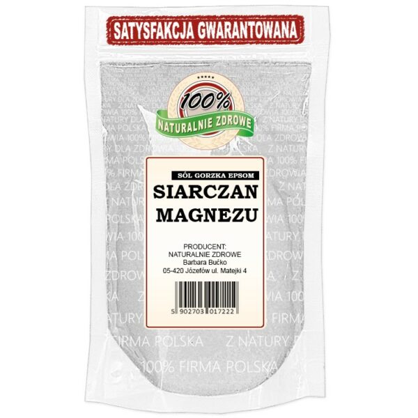 Połączenie siarki i magnezu, które znajdziemy w soli Epsom, ma dobroczynny wpływ na organizm zarówno z zewnątrz, jak i od środka. Magnez poprawia funkcjonowanie całego organizmu, wspomaga pracę układu nerwowego oraz wydalanie toksyn. Siarka z kolei ma silne właściwości antybakteryjne, wzmacnia ścianki układu pokarmowego oraz, podobnie jak magnez, działa detoksykująco. To sprawia, że właściwości soli Epsom są warte poznania, zwłaszcza że jej cena jest wyjątkowo przystępna!Zastosowanie soli EpsomSiarczan magnezu siedmiowodny, czyli inaczej sól Epsom lub sól gorzka, działa kojąco na skórę. To sprawia, że warto stosować go w przypadku egzemy, a nawet łuszczycy. Poza tym najnowsze badania wykazały, że nasze ciało ma zdolność absorbowania magnezu przez naskórek. Kąpiele w soli Epsom mogą być zatem doskonałym sposobem na uzupełnienie niedoborów tego pierwiastka oraz zdrowym i naturalnym sposobem na stres.Najlepiej sól w ilości od 100g do 250g (połowa do całej jednej szklanki) rozpuścić w wannie wypełnionej ciepłą wodą o temperaturze około 37 stopni Celsjusza. Odprężenie i poprawę stanu skóry przyniesie kąpiel około 20 minutowa.Kąpiel w soli Epsom ma również działanie przeciwbólowe i rozluźniające. Zaleca się ją osobom cierpiącym na bóle reumatyczne. Jest także doskonałym sposobem na relaks po długotrwałym wysiłku fizycznym. Zawarte w soli magnez i siarka działają rozluźniająco na spięte mięśnie.Niewielkie ilości soli Epsom rozpuszczone w dużej ilości wody są także skutecznym środkiem przeczyszczającym. Jeżeli cierpisz na zaparcia, warto skonsultować skorzystanie z siarczanu magnezu z lekarzem. Pamiętaj jednak, żeby nie przekraczać zalecanej dawki!Sól gorzka – gdzie kupić?Sól Epsom o CZDA na poziomie 100% dostępna w naszej ofercie to produkt najwyższej jakości, którego stosowanie jest całkowicie bezpieczne. Odwiedź nasz sklep i uzupełnij swoją apteczkę o ten uniwersalny środek! W Naturalnie Zdrowe kupisz sól Epsom również w 5 kg opakowaniu, które wystarczy Ci na bardzo długo.WłaściwościInformacja o alergenach: produkt jest czysty i całkowicie wolny od alergenów.Produkt jest odpowiedni dla wegetarian, wegetarian ovo-lacto, wegan, koeliaków i nietolerujących laktozy.Produkt posiada certyfikat koszerności i halal.PrzeciwwskazaniaNie stosować na uszkodzoną skórę i chronić oczy. STOSOWANIE WYŁĄCZNIE DO UŻYTKU ZEWNĘTRZNEGO.Skład: siarczan magnezu siedmiowodny 100%Kraj pochodzenia: NiemcyPrzechowywać w suchym i chłodnym miejscu niedostępnym dla dzieci.Opakowanie produktu może różnić się wyglądem w zależności od partii towaru.Data znajduje się na opakowaniu.PRODUCENT: NATURALNIE ZDROWE Barbara Bućko 05-420 Józefów ul. Matejki 4