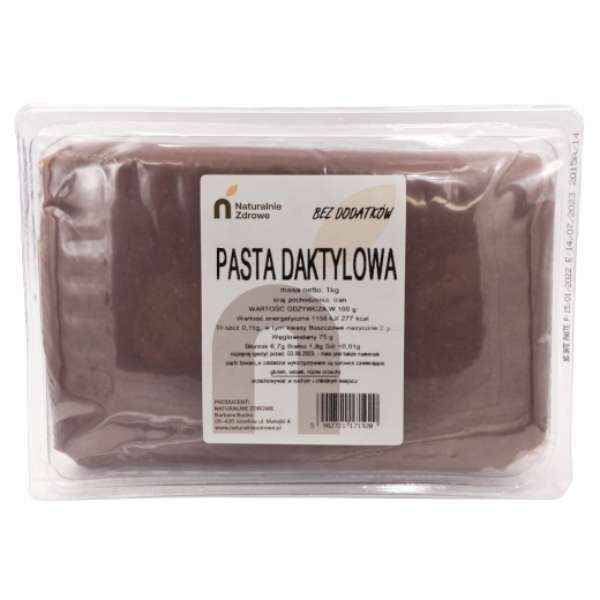 Daktyle to doskonałe źródło witamin i minerałów, a przy tym wysokoenergetyczna przekąska, która przypadnie do gustu zwłaszcza sportowcom. Pomimo sporej kaloryczności, daktyle zawierają też bardzo dużo błonnika, co czyni z nich doskonały posiłek zarówno przed, jak i potreningowy.Oczywiście zastosowanie dla daktyli znajdzie się nie tylko w sportowej diecie. Ze względu na swój słodki i neutralny smak daktyle mogą być doskonałym zastępstwem dla białego cukru, a także miodu. Zwłaszcza w formie pasty daktylowej.Jak jeść krem z daktyli?Pasta daktylowa to smaczny i zdrowy sposób na włączenie do codziennej diety tych wyjątkowych owoców. Masa daktylowa może być swobodnie dodawana do wypieków, koktajli czy owsianek. Poza tym krem daktylowy nadaje się również do przygotowywania zdrowszej wersji popularnych słodyczy, takich jak domowa wersja rafaello czy kulki jaglane. Dodając do pasty kakao i orzechy laskowe, zrobimy również domową nutellę, znacznie zdrowszą i smaczniejszą od tej sklepowej. Co więcej, pasta daktylowa, w przeciwieństwie do innych naturalnych substancji słodzących, takich jak na przykład miód, nie traci swoich prozdrowotnych właściwości w wysokich temperaturach.Gdzie kupić pastę daktylową?Gdzie kupić pastę daktylową? Znajdziesz ją w Naturalnie Zdrowe! Dostępna w naszej ofercie pasta została wykonana z najwyższej jakości daktyli, dzięki czemu zachowuje wszystkie składniki odżywcze oraz doskonały smak. Co więcej, jej cena jest wyjątkowo przystępna. Odwiedź nasz sklep i koniecznie wypróbuj nasz krem z daktyli!Skład: pasta z daktyli 100% bez dodatkówKraj pochodzenia: IranMasa netto: 1 kgW zakładzie wykorzystywane są surowce zawierające: gluten, sezam, różne orzechy.Data przydatności i numer partii towaru znajdują się na opakowaniu.Przechowywać szczelnie zamknięte w suchym i chłodnym miejscu.Opakowanie może różnić się wyglądem w zależności od partii towaru.Wartość odżywcza w 100 g produktuWartość energetyczna1147 kJ / 274 kcalTłuszcz0,5 gw tym kwasy tłuszczowe nasycone0,5 gWęglowodany72,5 gw tym cukry72,5 gBłonnik-Białko2,2 gSól1,0 mgPRODUCENT: NATURALNIE ZDROWE Barbara Bućko 05-420 Józefów ul. Matejki 4