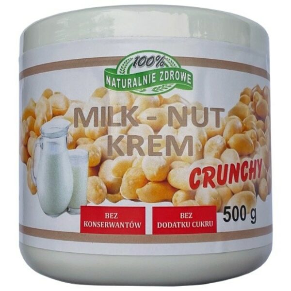 Krem orzechowo-mleczny crunchy od Naturalnie Zdrowe to świetna propozycja dla wszystkich osób aktywnych fizycznie, dbających o szczupłą sylwetkę i czytających uważnie etykiety. Bazę do naszych kremów stanowią orzeszki ziemne i pod względem chociażby konsystencji kremy są bardzo zbliżone do typowego masła orzechowego. Nasza propozycja to zdrowsza alternatywa dla popularnych kremów czekoladowych dostępnych w sklepach. Kremy Naturalnie Zdrowe to pyszne smarowidło charakteryzujące się jednocześnie dobrej jakości składem. W naszych kremach nie znajdują się żadne zbędne dodatki w postaci oleju palmowego, a cukier został zastąpiony zdrowszymi zamiennikami w postaci maltitolu i erytrolu. Kremy idealnie sprawdzą się jako pasta do kanapek, naleśników czy omletów. Można je też kłaść na wafle ryżowe czy po prostu spożywać na surowo jako rodzaj słodkiej przekąski. Nie trzeba się przy tym martwić o przybranie na wadze - sugerowana porcja to tylko 150 kcal. Spróbuj już dziś!Skład:Krem orzechowy arachidowy 100 % (50 %) [orzechy arachidowe prażone], substancja słodząca: maltitol, olejshea, orzechy laskowe, mleko w proszku odtłuszczone, kakao o obniżonej zawartości tłuszczu, serwatka zdemineralizowana w proszku (z mleka), miazga kakaowa, aromaty, emulgator: lecytyny (z soi).Wartości odżywcze w 100g:Wartość energetyczna2545 J613 kcalTłuszczw tym kwasy tłuszczowe nasycone47 g7,5 gWęglowodanyw tym cukry28 g8,2 gBłonnik5,1 gBiałko17 gSól0,0 gProducent: Naturalnie Zdrowe Barbara Bućko