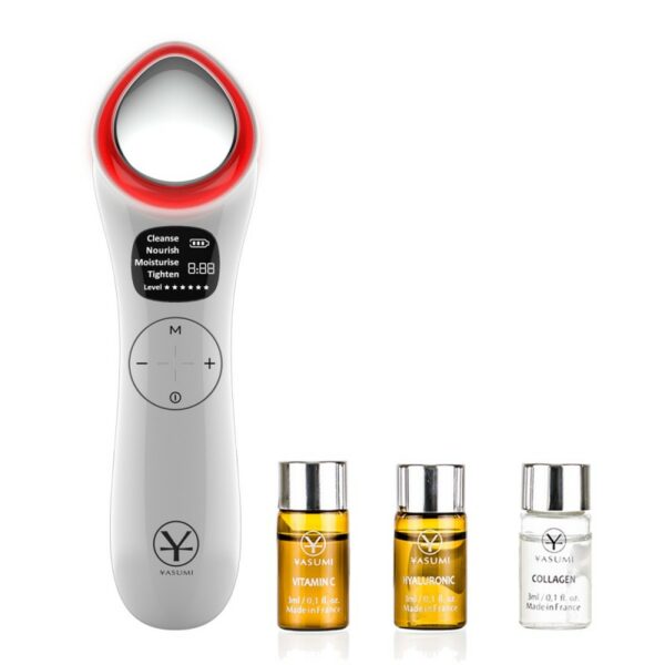 Shindo Ion - Masażer 5w1 + zestaw 3 ampułek. Mikromasaż + jonoforeza+ fototerapia + prąd galwaniczny + termoterapia. Shindo Ion to wielofunkcyjny masażer do twarzy, który generuje prąd galwaniczny i wibracje, które przynoszą skórze mnóstwo korzyści. Urządzenie wytwarza jony dodatnie i ujemne, dzięki czemu możesz dokładnie oczyścić skórę, wprowadzić w głąb skóry składniki aktywne preparatów do pielęgnacji skóry, i jednocześnie odmłodzić ją i zregenerować działaniem światła LED.Fototerapia wykorzystuje światło w kolorze niebieskim, czerwonym oraz żółtym. Kolor czerwony pobudza produkcję kolagenu i elastyny, dzięki czemu zmarszczki ulegają spłyceniu a skóra zyskuje jędrność i elastyczność. Kolor ten wykazuje działanie przeciwzapalne, łagodzi podrażnienia i zmniejsza zaczerwienienia. Kolor niebieski to leczenie zmian trądzikowych i zahamowanie procesów prowadzących do pojawienia się kolejnych zmian. Niszczy bakterie P.acne., a także zwęża pory i reguluje produkcję sebum. Kolor żółty pomaga w leczeniu alergii, łagodzi podrażnienia, poprawia przepływ limfy i wzmacnia system ochronny organizmu. Światło żółte wykorzystywane jest w leczeniu przebarwień, zmian naczyniowych, poprawia koloryt skóry, zwiększa syntezę kolagenu i elastyny, redukując blizny pooperacyjne i rozstępy.Termoterapia - urządzenie daje możliwość podgrzania głowicy do temperatury 45°C, co skutecznie poprawia przemianę materii, wzrost resorpcji składników aktywnych oraz działanie przeciwzapalne. Masażer można stosować razem z produktami pielęgnacyjnymi do skóry, takimi jak serum czy ampułki. Dodatkowa termoterapia dostarcza skórze energii cieplnej, co pobudza włókna kolagenowe.Masaż wibracyjny w połączeniu z wyższą temperaturą rozluźnia mięśnie i niweluje napięcie. Urządzenie posiada 4 tryby pracy, które używane w kolejności zapewnią kompleksową pielęgnację skóry. Od dokładnego oczyszczenia skóry z toksyn i porów z zanieczyszczeń, po odmłodzenie i ujędrnienie. Urządzenie ujędrnia skórę, spłyca zmarszczki i liftinguje skórę wokół oczu.Podczas wykonywania zabiegu korzystaj z takich kosmetyków jak serum, ampułka lub maseczka.Wskazania: utrata jędrności, potrzeba regeneracji, zmarszczki, detoksykacja, plamy pigmentacyjne i przebarwienia, nierówny koloryt skóry, blizny, rozstępy, podrażnienia, trądzik, nadprodukcja sebum, wiotka skóra, zaburzony owal twarzyW zestawie znajdują się 3 ampułki o pojemności 3ml każda: Witamin C - Ampułka rozświetlająca z Witaminą C. Ampułka z witaminą C przeznaczona jest do pielęgnacji każdego typu cery. Składniki ampułki są szczególnie potrzebne skórze zniszczonej ekspozycją na słońce, z oznakami fotostarzenia się, z rozszerzonymi naczynkami i o nierównomiernym kolorycie. Glikozyd askorbylowy (AA2G) będący prekursorem witaminy C, stymuluje fibroblasty skórne, inicjując syntezę kolagenu. Hamuje syntezę melaniny w melantocytach oraz redukuje istniejącą już melaninę, dzięki czemu chroni skórę przed powstawaniem przebarwień. Działa łagodząco na reakcje rumieniowe, zmniejsza zaczerwienienia skóry i wzmacnia naczynia krwionośne. Dodatkowo spowalnia procesy starzenia, ponieważ jest silnym antyoksydantem. Roślinne ekstrakty z grejpfruta i cytryny, obfite w witaminę C i kwasy owocowe, hamują procesy starzenia, delikatnie złuszczają naskórek i minimalizują przebarwienia. Skóra jest rozświetlona i promienna i odświeżona. Wskazania: przebarwienia, zmarszczki, utrata jędrności, podrażnienia, martwe komórki naskórka, skóra szara i ziemista.Dry Skin - Ampułka ultra nawilżenieAmpułka Dry Skin to natychmiastowe uczucie komfortu przeznaczone dla skóry suchej. Ampułka przywraca naturalną barierę lipidową skóry. Formuła Lipidure wiąże i zatrzymuje cząsteczki wody w skórze, wzmacniając jednocześnie strukturę lipidów międzykomórkowych. Kwas hialuronowy zapewnia intensywne nawilżenie, spłycając zmarszczki i zapobiegając destrukcji włókien kolagenowych. Gliceryna długotrwale zatrzymuje wodę w skórze, miód odżywia, a pektyny tworzą na powierzchni skóry ochronny film wygładzający. Skóra jest promienna, ożywiona i jedwabiście gładka.Wskazania: niedostateczny poziom nawilżenia, skóra sucha i odwodniona, zmarszczki, potrzeba odżywienia i regeneracjiMarine Collagen - Ampułka z kolagenem morskim. Ampułka z kolagenem morskim jest dedykowana w szczególności skórze przesuszonej, z widocznymi oznakami starzenia i zmęczenia. Kolagen morski doskonale nawilża skórę, przez co zapewnia jej sprężystość i elastyczność. Skóra jest wygładzona a zmarszczki spłycone. Dodatkowo, chroni on skórę przed szkodliwym działaniem czynników zewnętrznych. Wskazania: skóra sucha i odwodniona, zmarszczki, skóra szara i zmęczona, utrata jędrności