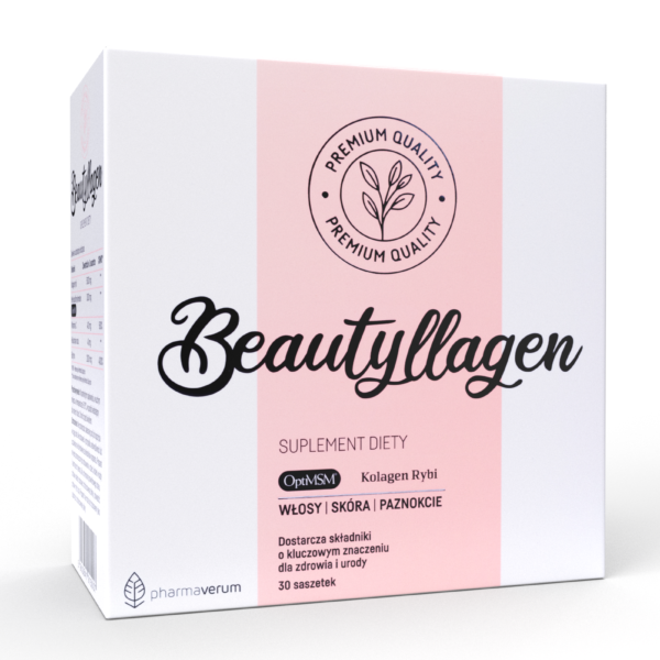 Beautyllagen - Kolagen + Kwas Hialuronowy + Biotyna - suplement. Kolagenowy suplement z najczystszym związkiem siarki, witaminą C, kwasem hialuronowym i biotyną. To właśnie kolagen jest fundamentem zdrowej młodej skóry, jędrnej i sprężystej. Pierwsze oznaki starzenia pojawiają się, gdy spada jego ilość w organizmie, stąd tak ważnym jest jego uzupełnianie. Beautyllagen to najwyższej jakości składniki, które stymulują tworzenie nowych tkanek i produkcję kolagenu. Kolagen to białko, które jest najważniejszym budulcem skóry właściwej i odpowiada za gęstość skóry, jędrność i jej elastyczność. Zapewnia prawidłowe funkcjonowanie chrząstki stawowej i tkanki łącznej. Siarka organiczna, to naturalny związek siarki wspierający kondycję skóry, włosów i paznokci. Jego działanie potwierdzono licznymi badaniami klinicznymi, i jest marką zastrzeżoną Bergstrom® Nutrition. Kwas hialuronowy występuje naturalnie w organizmie, jednakże jego niedobór uruchamia procesy starzeniowe. Kwas hialuronowy doskonale dba o pełne nawilżenie skóry, nawadniając skórę "od środka". Witamina C - jej zadaniem jest wspieranie produkcji kolagenu dla zachowania prawidłowego funkcjonowania skóry. Ponadto chroni komórki przed stresem oksydacyjnym, wspiera układ odpornościowy oraz redukuje uczucie zmęczenia. Biotyna pomaga w zachowaniu zdrowej skóry, włosów i paznokci.Wskazania: oznaki starzenia się skóry, utrata jędrności, utrata gęstości, zmarszczki, słabe włosy i paznokcie Pojemność: 30 saszetek