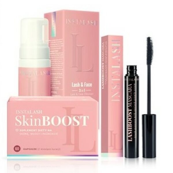 Lash & Face Cleanser 3in1 100ml / SkinBoost 60 kapsułek / LashBoost Mascara 10ml - Zestaw Stymulujący Porost Rzęs. Zestaw regeneruje, pogrubia i wydłuża rzęsy podczas codziennego makijażu oraz mycia twarzy. Naturalne składniki wzmacniają rzęsy u nasady, nawilżają je i hamują ich wypadanie. W zestawie znajduje się mascara do rzęs z regenerującym serum, pianka do mycia twarzy która łagodzi podrażnienia, oczyszcza rzęsy i wzmacnia je. Naturalny wegański suplement dostarcza skórze, włosm, rzęsom i paznokciom bogactwa witamin, nadając skórze blasku, wygładzając zmarszczki, i pielęgnując rzęsy i włosy od nasady, aż po same końce.W skład zestawu wchodzą:Lash & Face Cleanser 3in1 100ml - Pianka do Mycia Rzęs i TwarzyPianka zapewnia kompleksowe oczyszczenie i pielęgnację skóry twarzy, rzęs oraz brwi. Jeden kosmetyk zastępuje kilka innych, ponieważ spełnia szereg dobroczynnych funkcji. Zawarta w piance Betaina nawilża skórę i rzęsy, wzmacnia je i odżywia. Pianka sprawia, że rzęsy są mocniejsze i nie łamią się. Rzęsy przestają wypadać i stają się grubsze. Pianka nie powoduje podrażnień, regeneruje brwi i rzęsy, a stosowana przed wykonaniem przedłużania rzęs sprawia, że te dłużej się utrzymują. Dokładnie i delikatnie oczyszcza rzęsy przedłużane. Już 20 dni wystarczy, aby zaobserwować efekty jej stosowania. Cera sucha odzyskuje właściwy poziom nawilżenia i blask, doskonale sprawdzając się w pielęgnacji cery wrażliwej, naczynkowej i skłonnej do podrażnień. Francuska woda termalna dostarcza skórze bogactwa minerałów, Actibiome przywraca jej naturalny poziom Ph, co sprawdzi się szczególnie przy cerze z niedoskonałościami. Phytofoam działa antybaketeryjnie, uelastycznia skórę i odżywia. Wskazania: oczyszczanie, słabe i wypadające rzęsy i brwi, cera sucha i wrażliwaPojemność: 100mlSkinBoost 60 kapsułek - Booster Piękna - suplementWszystkie najważniejsze składniki wzmacniające włosy, rzęsy i paznokcie, a także ujędrniające skórę, zostały zamknięte w kaspułakch, wystarczających aż na 2 miesiące kuracji. Suplement oczyszcza organizm z toksyn - a tym samym cerę z niedoskonałości. Wyłącznie naturalne składniki suplementu ujędrniają skórę, dodają jej blasku oraz niwelują oznaki fotostarzenia. Zmniejsza się wydzielanie sebum na skórze, a włosy mniej się przetłuszczają. Włosy, paznokcie i rzęsy są wzmocnione i szybciej rosną, przestają się łamać. Retinol, kwas foliowy, witaminy C, B1, B2, B5 i B6 zmniejszają ilość zmarszczek i poprawiają wzrost włosów, stymulują syntezę kolagenu w skórze i rozjaśniają skórę. Kolagen morski nawilża, regeneruje i uelastycznia. Biotyna i ekstrakt ze skrzypu polnego uwalnia toksyny nagromadzone w organizmie, zapobiega przetłuszczaniu sie skóry, a ekstrakt z pokrzywy dodatkowo zmniejsza wytwarzanie łoju. Produkt jest naturalny, bezglutenowy i wegański. Wskazania: słabe włosy, rzęsy, paznokcie, zmiany skórne, nadprodukcja sebum, przetłuszczanie włosów, niedostateczny poziom nawilżeniaPojemność: 60 kapsułek LashBoost Mascara 10ml - Mascara do Rzęs z SerumTusz do rzęs z naturalnym kompleksem składników stymulujących wzrot rzęs, poprawiających ich grubość i długość. Kosmetyk nie zawiera Bimatoprostu (sztucznego stymulantu), więc jest całkowicie bezpieczny dla rzęs i przerywając jego stosowanie, nie ma obaw, że rzęsy zaczną wypadać czy słabnąć. Naturalna odżywka zawarta w mascarze pozostawia efekt jeszcze długo po zakończonej kuracji. Receptura Baicapil, L-Arginine oraz Phantenol uszczelniają powierzchnię rzęs, nawilżają je, wzmacniają u podstawy, zwiększają wzrost i hamuje wypadanie. Dzięki mascarze, wykonując codzienny makijaż jednocześnie regenerujesz rzęsy by już po 30 dniach cieszyć się z efektów działania serum.Wskazania: makijaż, osłabione i wypadające rzęsyPojemność: 10ml