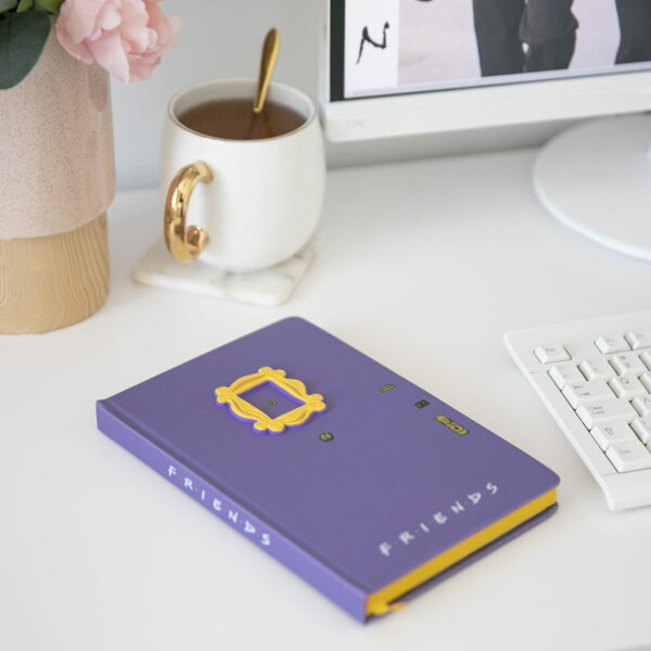 Dane: Zeszyt formatu A5, 240 stron w linię, Uchwyt na długopis, Twarda okładka spinana żółtą gumką. Fioletowy notatnik inspirowany drzwiami najsłynniejszego mieszkania w Nowym Yorku! Przenieś się z nami do świata Przyjaciół; notuj swoje ulubione cytaty, teksty piosenek Phoebe i numery telefonów nowych znajomych poznanych przy cappuccino w lokalnej kawiarni tak podobnej do Central Perku. Zeszyt posiada twardą okładkę spinaną gumką, kryjącą 240 stron w szeroką linię. Każdą z nich ozdobiono dodatkowo logiem serialu wzdłuż dolnej krawędzi. Oficjalny produkt na licencji Friends™, wyprodukowany przez Pyramid International™