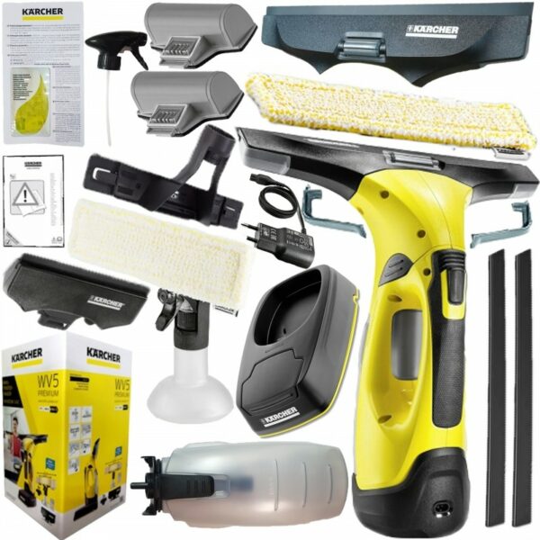 Myjka do okien Karcher WV 5 PremiumOryginalne wyposażenie standardowe:Litowo-jonowy akumulatorZapasowy litowo-jonowy akumulatorStacja ładowaniaSpryskiwaczPad z mikrofibryŚrodek do czyszczenia okien (koncentrat), 1 x 20 mlSsawka szerokaSsawka wąskaListwy zbierające 2-sztZbiornik na brudną wodęInstrukcja obsługi w języku polskimPudełkoNajnowszy model myjki do okien Kärcher. Poręczne urządzenie do mycia okien bez smug, zacieków na parapetach i brudnych rąk.Szybkie i proste czyszczenie okien jest teraz jeszcze łatwiejsze!Nowy model posiada pojemniejszą baterię i trzystopniowy wskaźnik LED pokazujący stopień jej naładowania. Rozładowaną baterię można łatwo wyjąć i zastąpić naładowaną (druga bateria dostępna do dokupienia jako opcjonalne wyposażenie). Mniejsza waga i niższy poziom emitowanego hałasu przekładają się na bardziej komfortowe czyszczenie okien. Zbiornik wody brudnej jest łatwy do opróżnienia. Gumowany uchwyt pozwala pewniej trzymać urządzenie podczas czyszczenia okien. Ssawka WV 5 posiada regulowaną odległość czyszczenia. Regulacja jest pomocna w przypadku czyszczenia okna wzdłuż silikonowego łączenia szyby z futryną. By gumowe listwy myjki nie najeżdżały na silikon wystarczy ustawić odpowiednią odległość czyszczenia od futryny okna. W wyposażeniu środek do czyszczenia okien (koncentrat – 1 x 20 ml), butelka ze spryskiwaczem, pad z mikrofibry, ssawka, bateria litowo-jonowa oraz ładowarka.Dane techniczne:Szerokość ssawki (mm): 280 + 170Zbiornik wody brudnej (ml): 100Czas ładowania akumulatora (min.): 185Czas pracy ciągłej na akumulatorze (min.): 35Wydajność powierzchniowa na 1 ładowanie: Około 210 m² = 70 okienZasilanie (V/Hz): 100 - 240 / 50 - 60Ciężar z akumulatorem (kg): 0,7Wymiary (dł. x szer. x wys.) (mm): 125 x 280 x 320