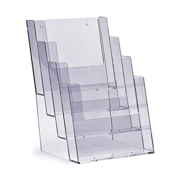Stojak na ulotki A5 poczwórny - 4 kieszenie A5 w orientacji pionowej. Wykonany z przezroczystego akrylu, do powieszenia na ścianę bądź postawienia na biurku lub ladzie.