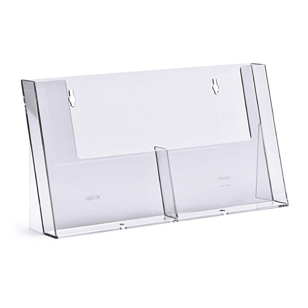 Stojak na ulotki A5 podwójny - 2 kieszenie A5 pionowe obok siebie. Wykonany z przezroczystego akrylu, do postawienia na biurku lub ladzie.