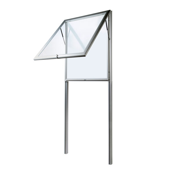 Wolnostojąca, bardzo głęboka gablota przeznaczona jest do użytku na zewnątrz. Trwała, wytrzymała i szczelna anodowana rama ma kolor srebrny. Szyba wykonana z bezpiecznego szkła hartowanego o grubości 4 mm. Antykorozyjny, stalowy panel tylny umożliwia stosowanie magnesów i markerów. Drzwi otwierają się do góry za pomocą pneumatycznego siłownika. Są zamykane na kluczyk - 1 lub 2 zamki bębenkowe. Głębokość wewnętrzna to aż 50 mm, dlatego możesz umieścić w niej sztandary, medale, itp. Dzięki nachodzącym na siebie elementom konstrukcji, gablota nie posiada ostrych krawędzi, co czyni ją bardzo bezpieczną w użytkowaniu. Zewnętrzna głęboka gablota jest odpowiednia do zamontowania na wolnostojących słupkach do wkopania.