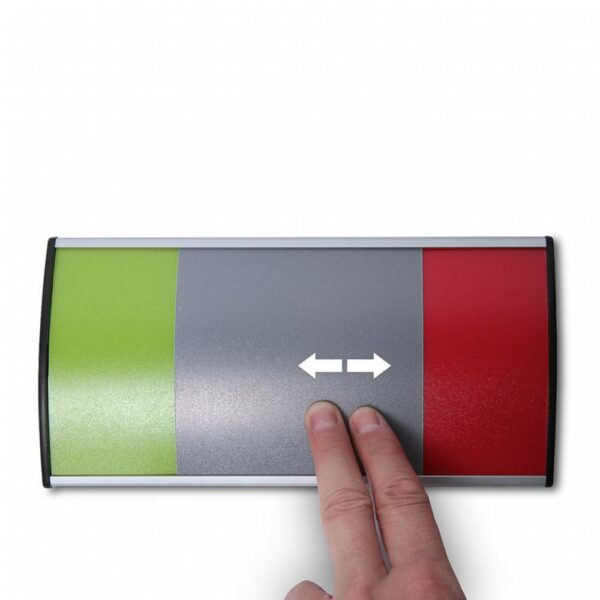 Praktyczny system informacyjny, który przy pomocy prostego rozwiązania przesuwanego wyraźnie pokazuje dostępność sali. Kolor zielony - sala jest wolna, kolor czerwony - sala jest zajęta. Plecy wykonane z aluminium. Boki wykończone czarnym plastikiem. Tabliczkę można w prosty sposób przymocować bezpośrednio do drzwi lub w ich najbliższym otoczeniu. Przesuwany system informacyjny to proste rozwiązanie do zastosowania w salach konferencyjnych, biurach lub poczekalniach, dzięki któremu zaoszczędzisz czas i zagwarantujesz spokój podczas pracy.