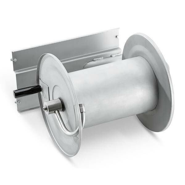 Bęben na wąż HP ze stali szlachetnej w zestawie do montażu w HD cage klasy super. Do właściwego i bezpiecznego przechowywania węży wysokociśnieniowych (wraz z wężem przyłączeniowym do wejścia urządzenia ciśnieniowego). Obracany pod ciśnieniem z przyłączem 22 x 1.5.