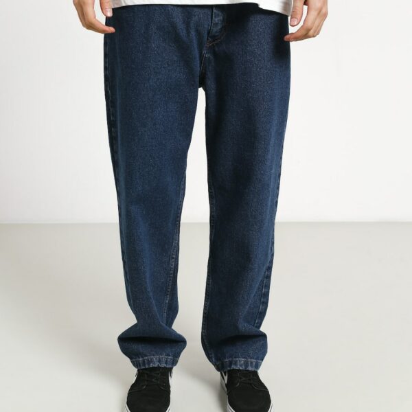 Materiał: 100% bawełna • Wysoki stan • Zapinane na guzik i suwak • Klasyczny układ kieszeni • Proste nogawki • Naszywka na prawej kieszeni • Luźny krój