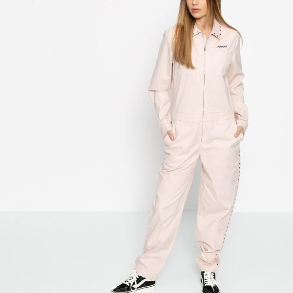 Część kolekcji wykonanej we współpracy Vans i Sandy Liang • Materiał: 98% bawełna, 2% elastan • Kombinezon Vans X Sandy Liang ma metalowy zamek błyskawiczny, dwie wpuszczane przednie kieszenie, dwie naszywane kieszenie na piersi i dwie kieszenie na piersiach. Nogawki i kołnierzyk ozdobione srebrnymi ćwiekami • Prosty kołnierzyk • Szlufki naszyte w pasie
