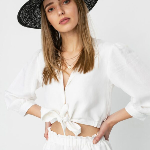 Materiał: 55% len, 45% wiskoza • Zapinana i wiązana na przodzie • Luźny krój idealny na lato • Rozpinane rękawy 3/4