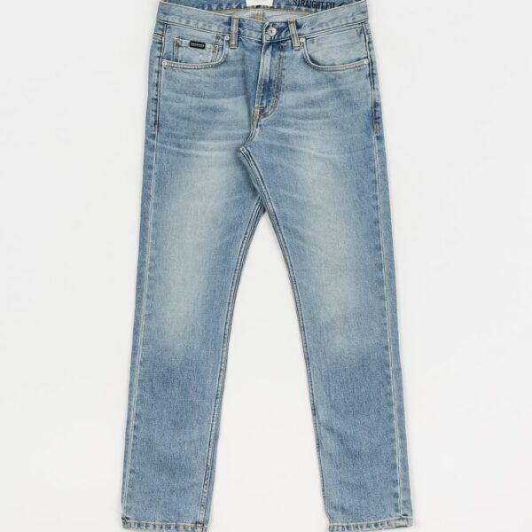 Jeansowe spodnie idealne na letnie wypady na miasto • Materiał: 99% bawełna, 1% elastan • Zapinane na zamek i guzik • Klasyczny układ kieszeni • Na przodzie kieszenie wzmacniane nitami • Lekko przecierane
