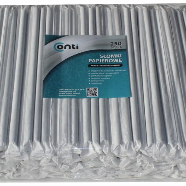 Ekologiczne słomki do napojów wykonane z papieru pakowane osobno Średnica: 6 mm Długość: 197 mm Kolor: biały Pakowane po 250 sztuk