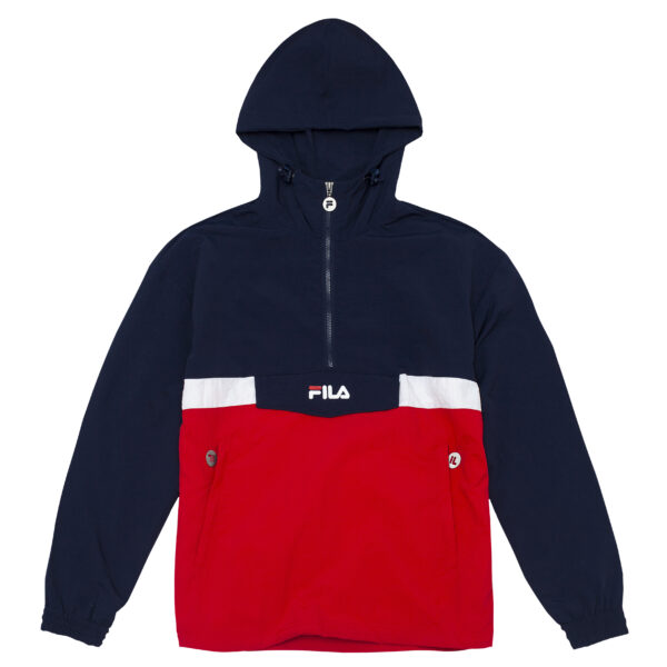 Kurtka marki Fila w klasycznych kolorach czerwony-biały-granatowy. Kurtka posiada dwie kieszenie zapinane na suwak. Na froncie posiada małe logo marki oraz większe logo na plecach.
